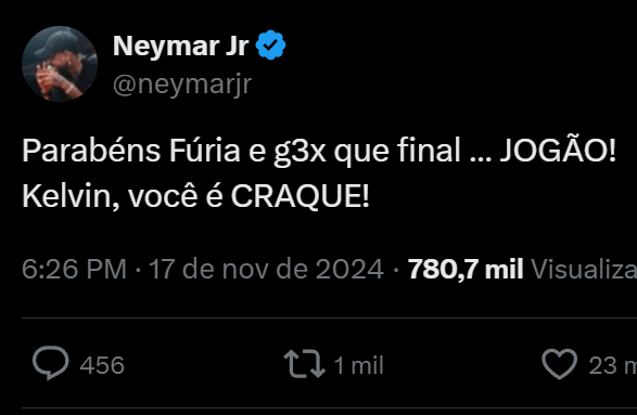 “Parabéns Fúria e g3x que final … JOGÃO! Kelvin, você é CRAQUE!“, escreveu o jogador na rede de textos curtos.