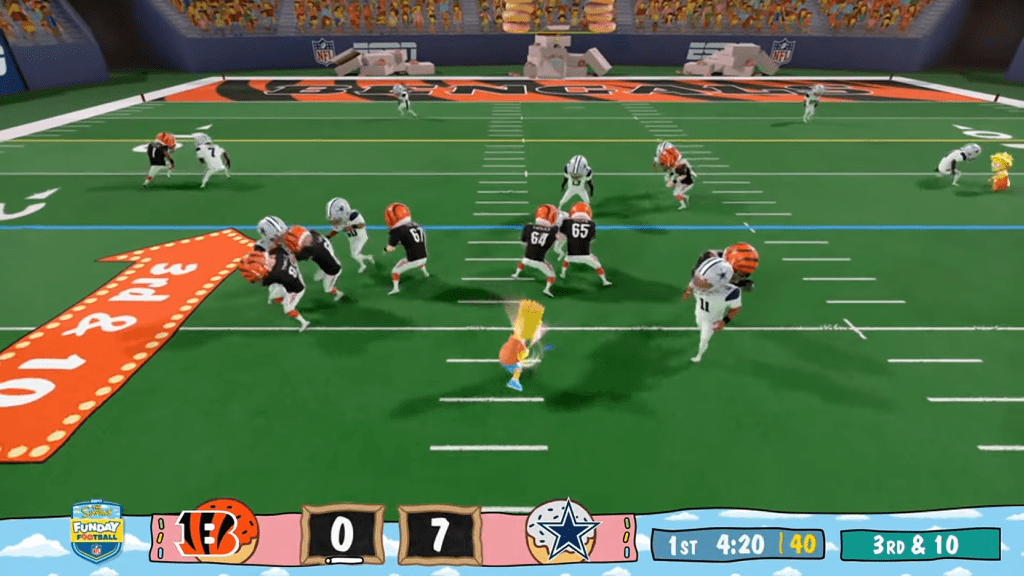 Os fãs de futebol americano que ligaram a TV na ESPN 3 nesta segunda para assistir ao Monday Night Football tiveram uma surpresa, o jogo entre Cowboys x Bengals foi transmitido ao vivo com gráficos animados do desenho “Os Simpsons”, graças a tecnologia Beyond Sports da Sony, capaz de transformar jogadas em tempo real em modelos renderizados em 3D.