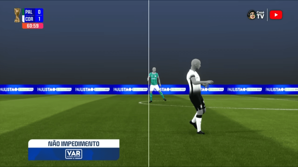 O único gol da partida, marcado por Yuri Alberto com assistência de Depay, foi o momento em que a tecnologia entrou em cena. O atacante recebeu a bola do neerlandês em posição claramente legal, muitos metros atrás da linha de defesa do Palmeiras, e finalizou com categoria para garantir a vitória do Timão. Não havia qualquer dúvida sobre a validade do lance — nem mesmo o mais fanático torcedor adversário poderia contestar. Ainda assim, a transmissão da FPF fez questão de exibir as linhas do impedimento semiautomático, mostrando o óbvio: Yuri Alberto estava em posição regular.